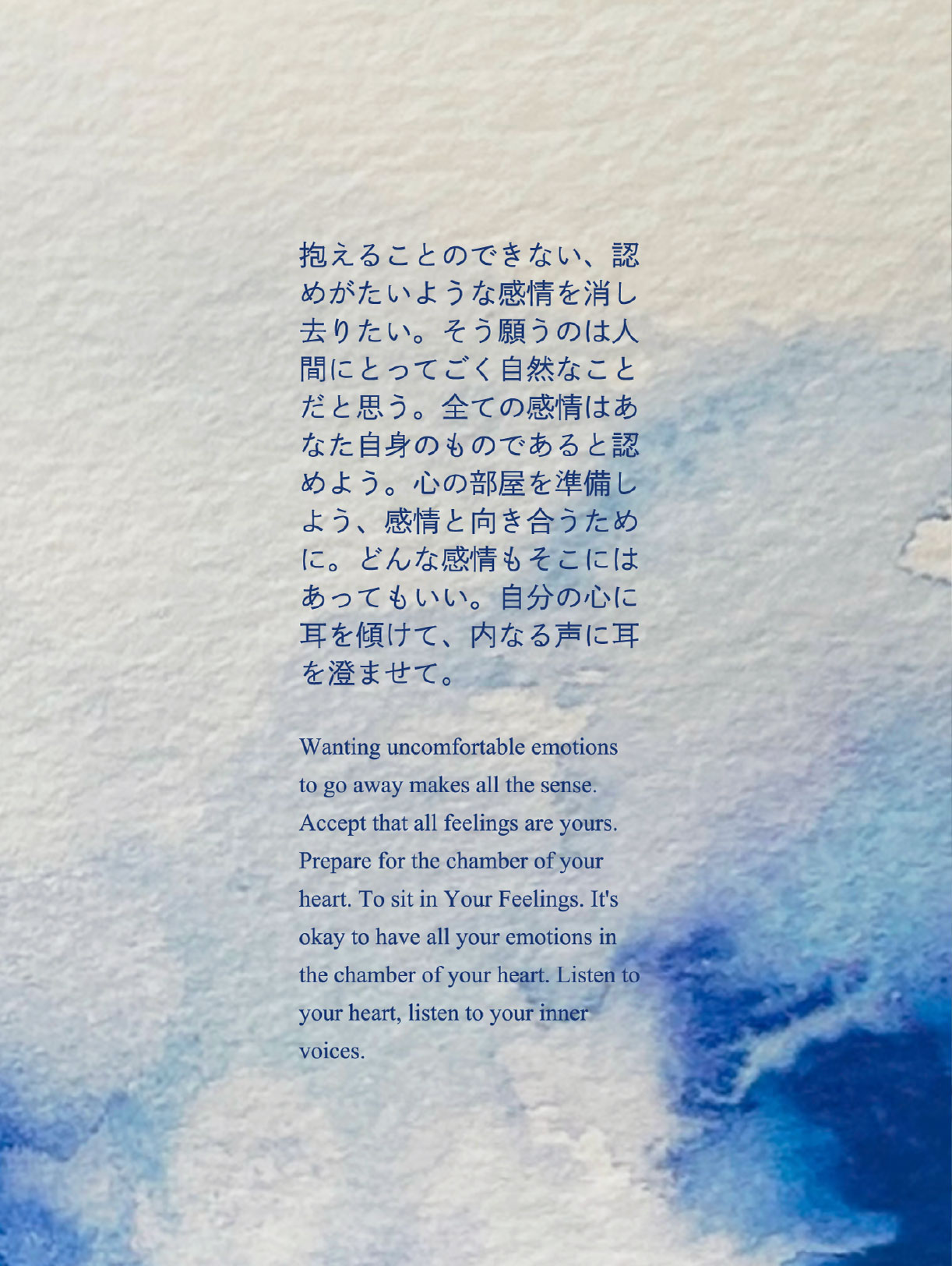 抱えることのできない認めがたいような感情を消し去りたいと願うのは人間にとってごく自然なことだと思う。全ての感情はあなた自身のものであると認めていく。心の部屋を準備しよう、感情と向き合うために。どんな感情もそこにはあってもいい。自分の心に耳を傾けて、内なる声に耳を澄ませて。